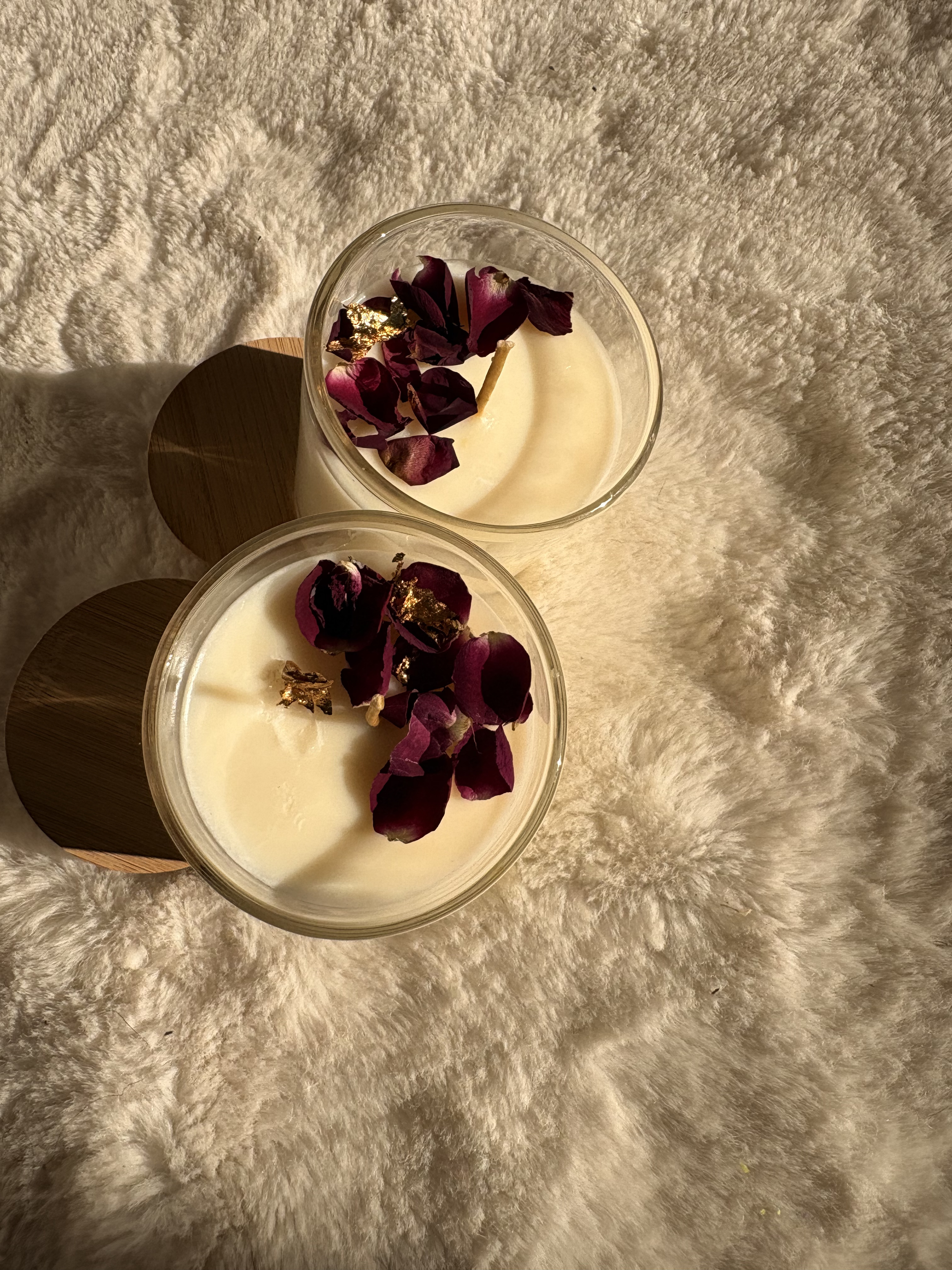 Delicately adorned with real dried rose petals and shimmering gold flakes, this candle is as visually captivating as it is fragrant. Each burn releases a luxurious floral embrace that feels both elegant and empowering—like stepping into a garden where every petal tells a story of beauty, strength, and quiet confidence.